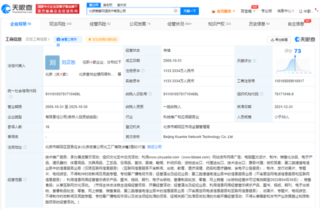 天眼查App显示,音悦台关联公司为北京宽客网络技术有限公司,该公司成立于2005年10月,法定代表人为刘正恕,注册资本约1133万人民币,久久综合日本久久综合由张斗、苏同、张妍等共同持股。经营范围包括制作、发行动画片、专题片、电视综艺;经营演出及经纪业务;利用信息网络经营音乐娱乐产品;从事互联网文化活动等。
