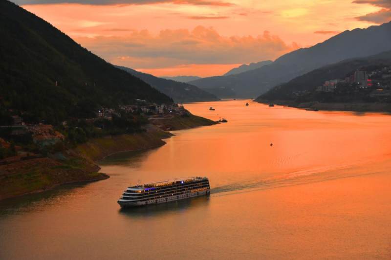 巫峡上空彩霞满天,船只航行在霞光中,如漂亮的油画,美不胜收(摄影/王忠虎)