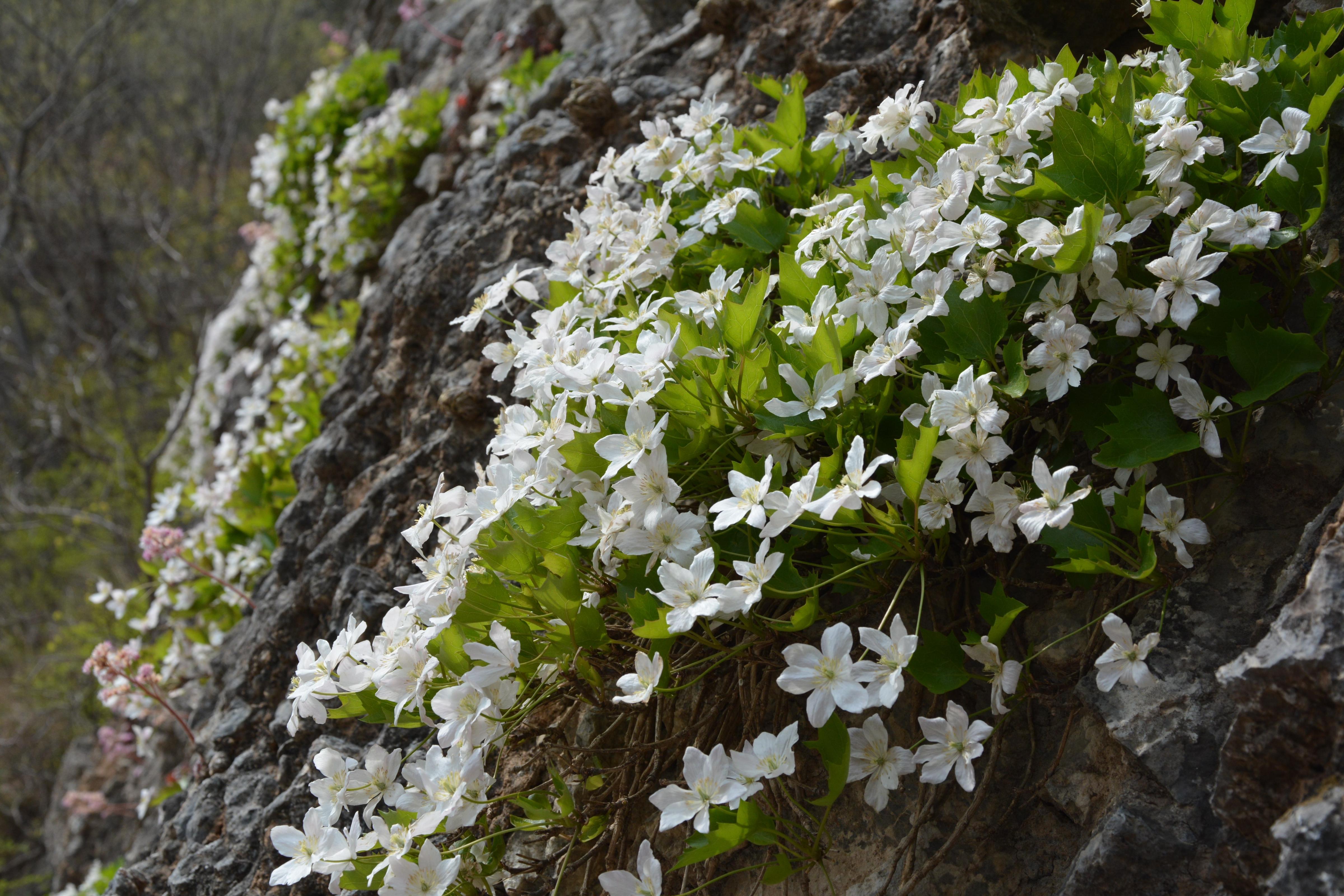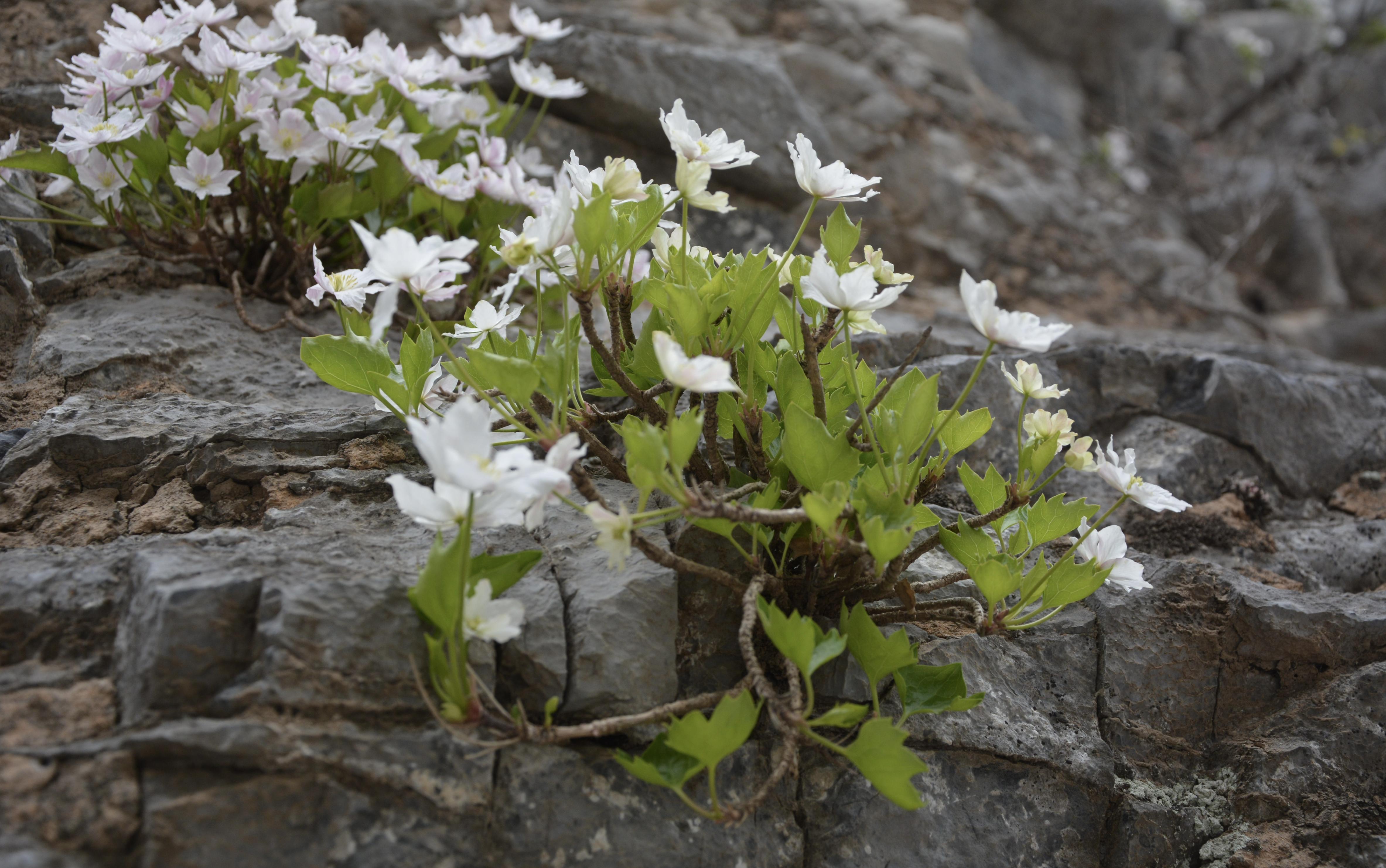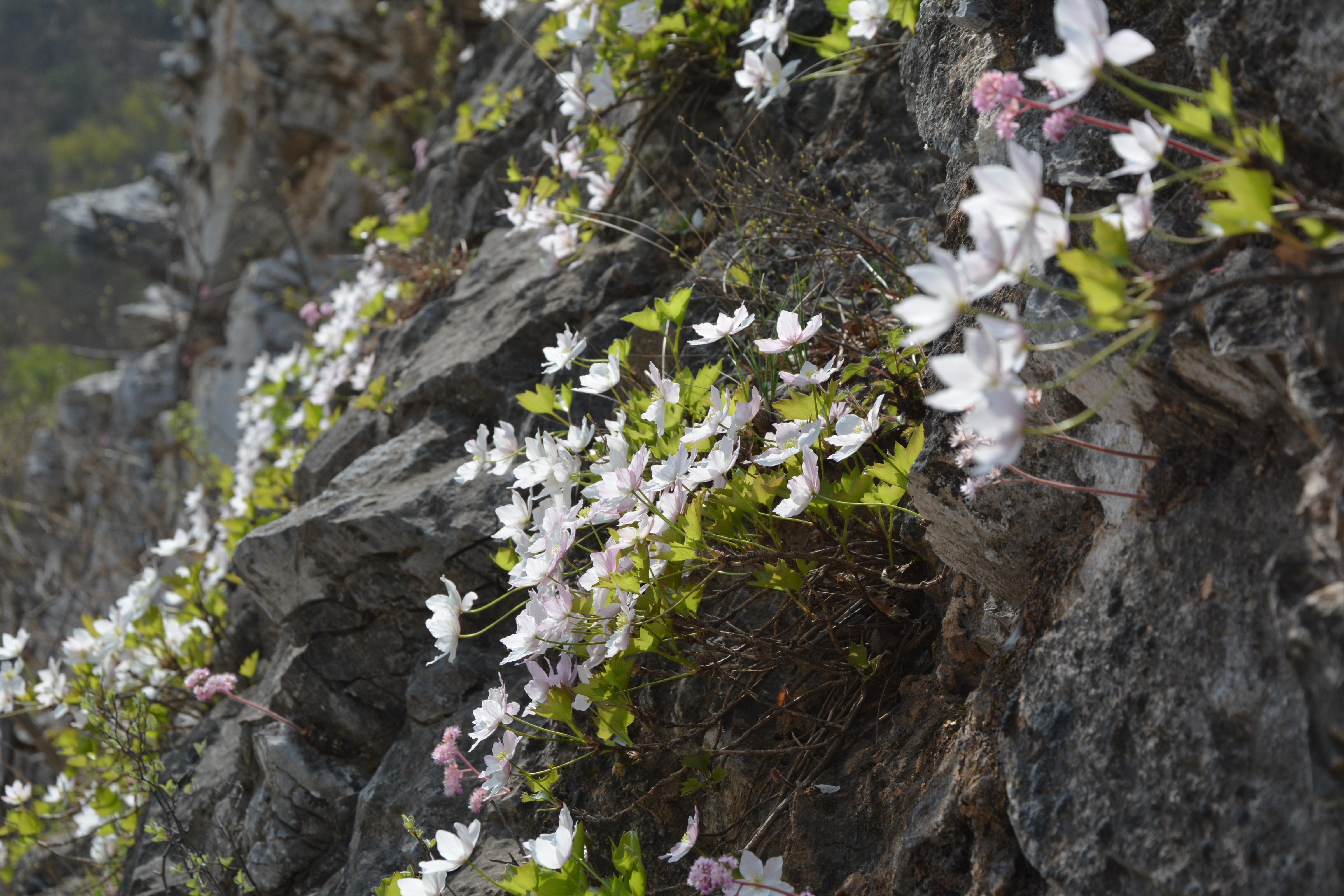 槭叶铁线莲与独根草、房山紫堇并称“崖壁三绝”,含苞待放时的槭叶铁线莲呈红粉色,花瓣全部舒展时的槭叶铁线莲则呈白粉色,微风吹拂,花枝摇曳,宛如悬于绝壁间的花瀑,婉约动人。