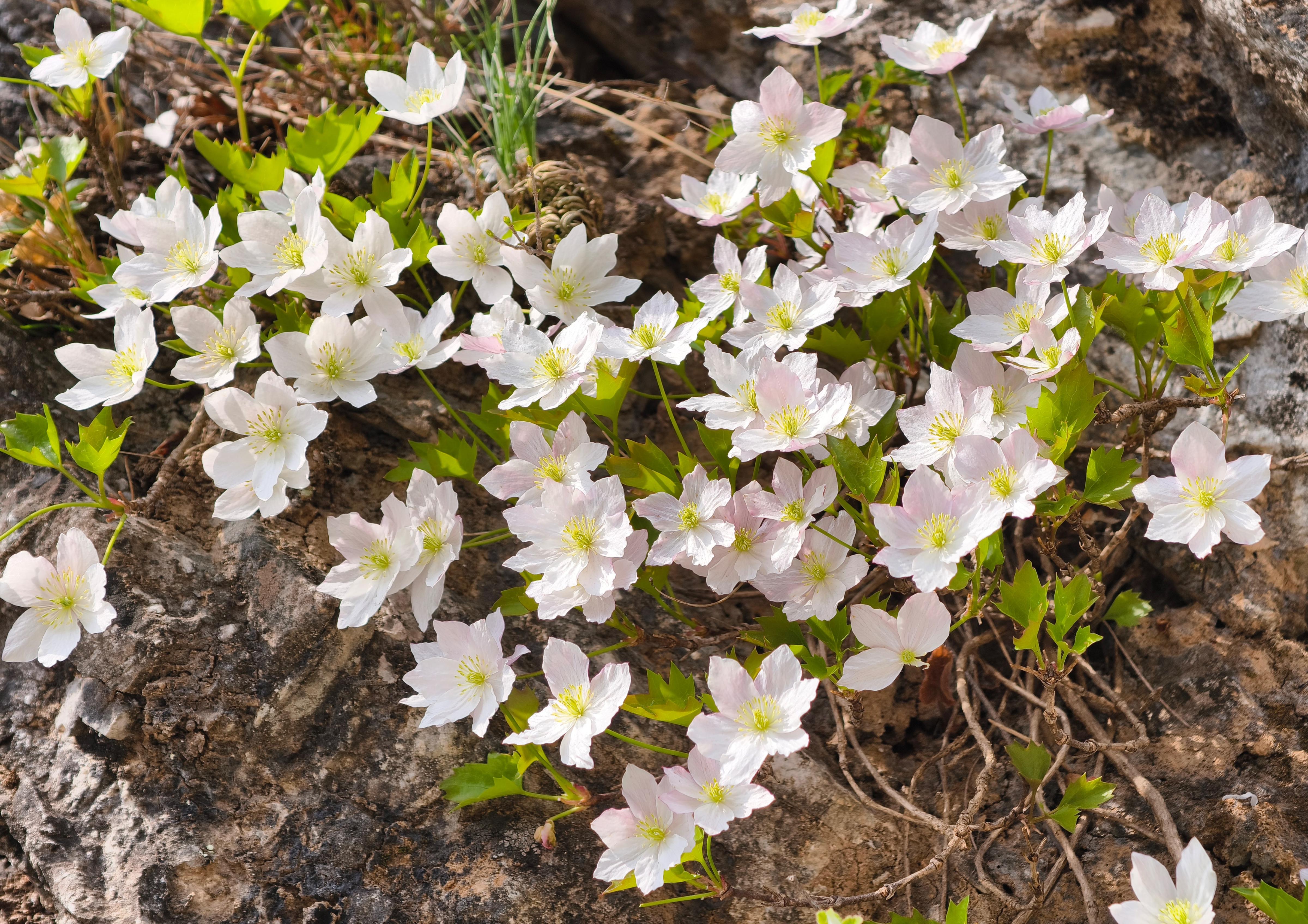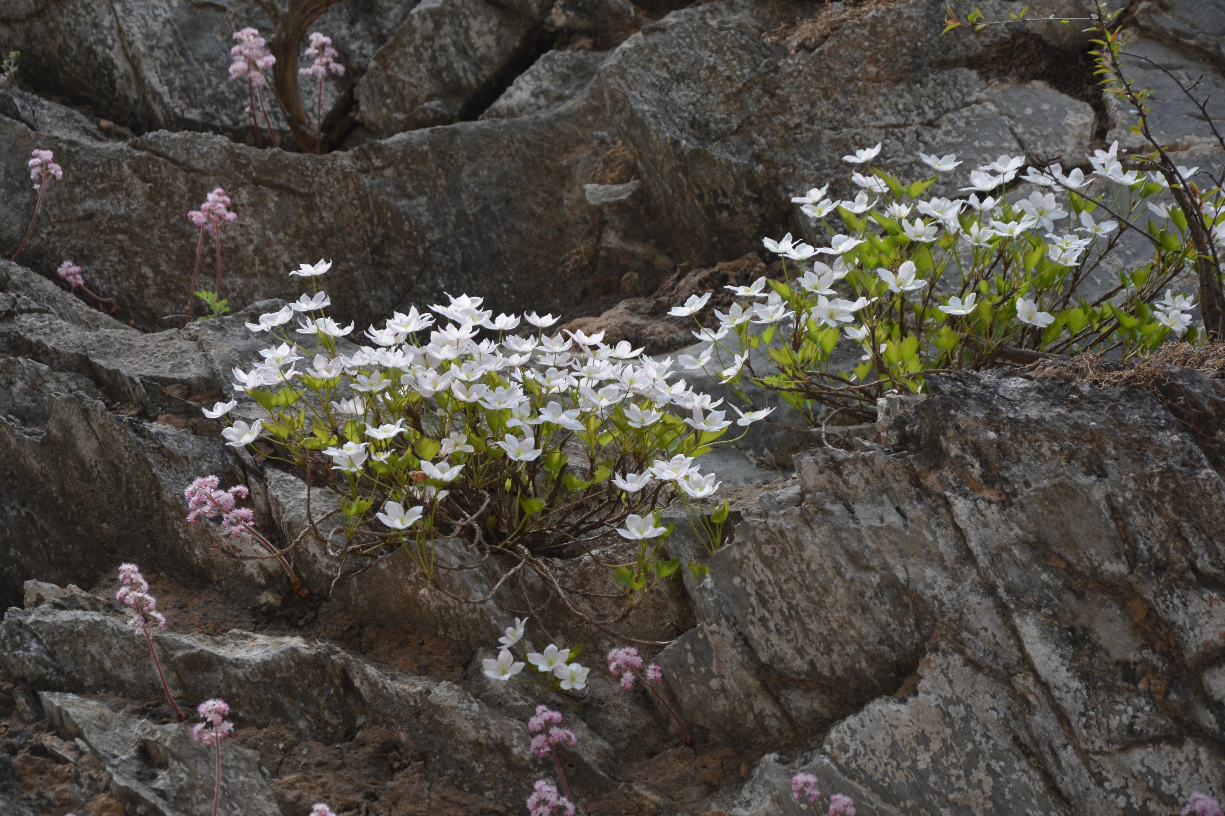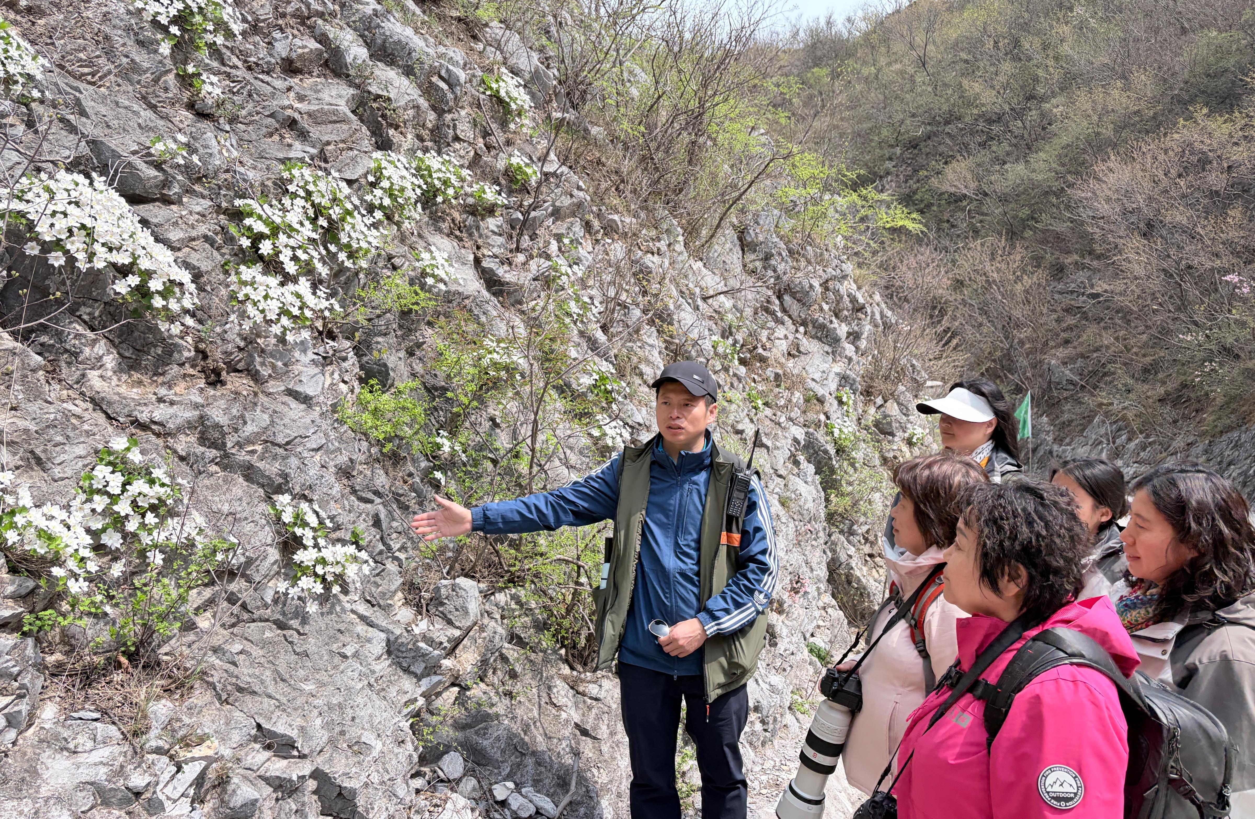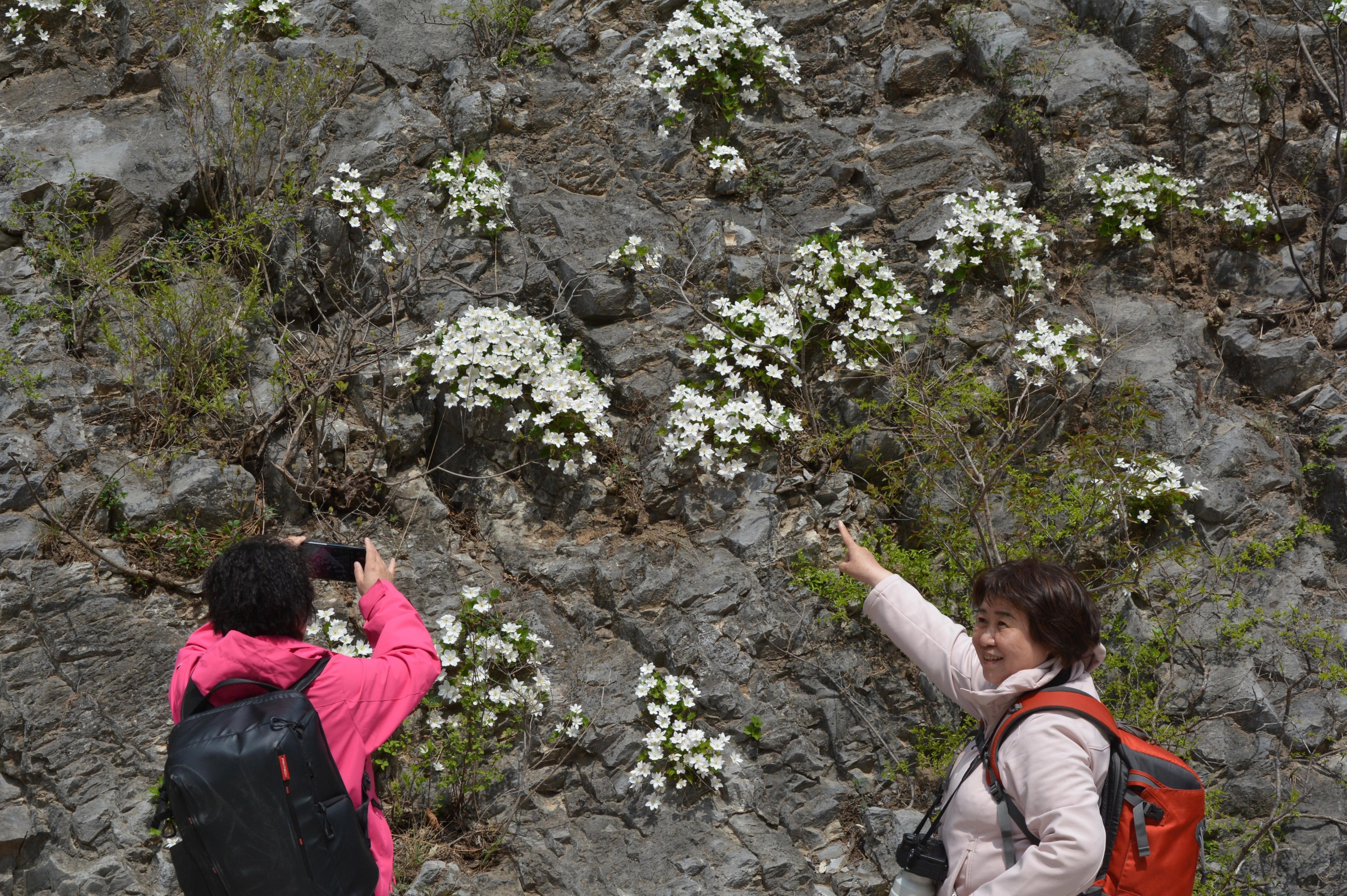 槭叶铁线莲与独根草、房山紫堇并称“崖壁三绝”,含苞待放时的槭叶铁线莲呈红粉色,花瓣全部舒展时的槭叶铁线莲则呈白粉色,微风吹拂,花枝摇曳,宛如悬于绝壁间的花瀑,婉约动人。