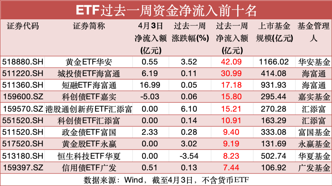 Wind数据显示,截至4月3日,黄金ETF华安“吸金”超42亿元,位居全市场非货ETF榜首。此外,跟踪黄金股板块的黄金股ETF永赢过去一周也获得超9亿元的资金净流入,跻身全市场非货ETF前十名。