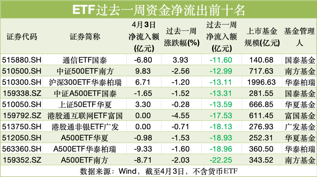 从资金流向上看,此前跌幅较大的黄金ETF及港股通创新药ETF、恒生科技ETF获资金逆市抄底,多只中证A500ETF位居资金净流出榜前列。