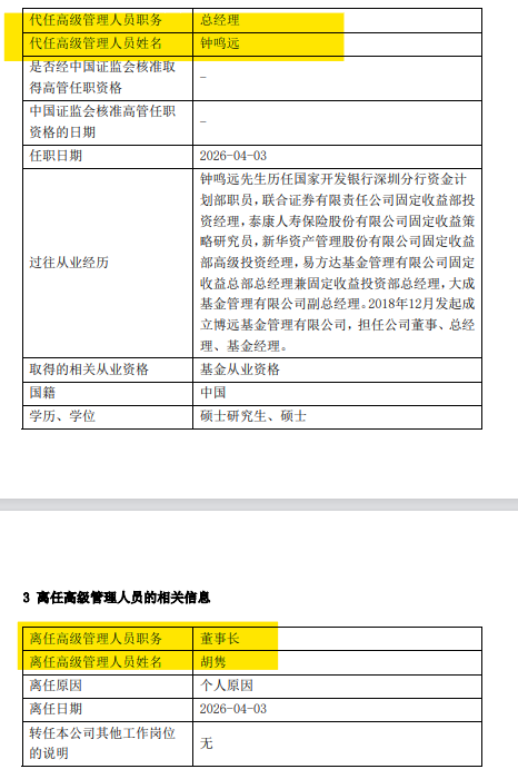 4月4日,博远基金发布高级管理人员变更公告,董事长胡隽因个人原因离任,总经理钟鸣远于4月3日起代任董事长一职。